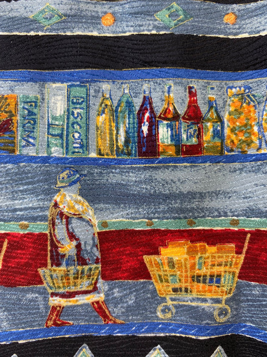 90s Deadstock Silk Necktie, Men's Vintage Black/ Blue/ Red Grocery Shopping Print Tie, NOS
