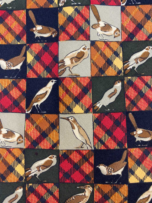 90s Deadstock Silk Necktie, Men's Vintage Gold/Red/Green Check Plaid Bird Pattern Tie, NOS