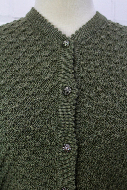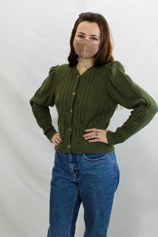 Vintage 1980s Green Wool Austrian Cardigan, Puff Sleeves, Deadstock, Medium