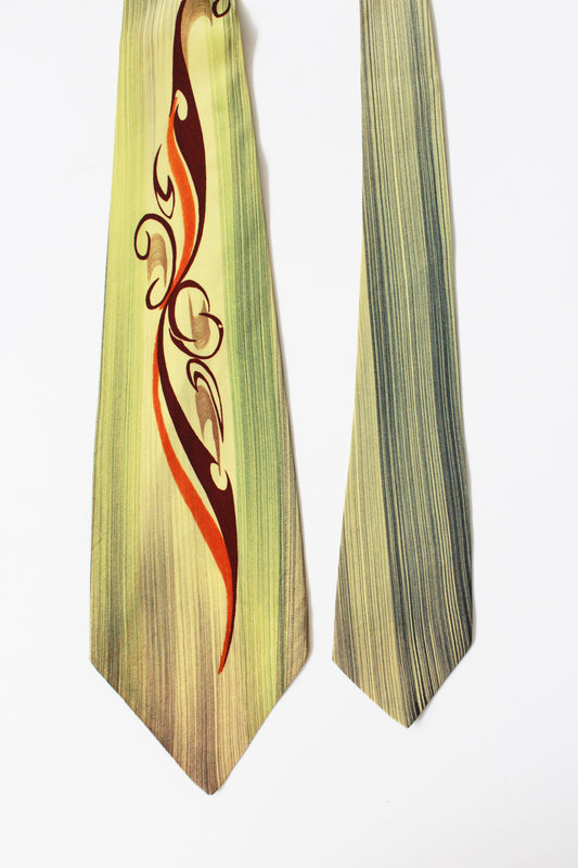 Vintage 1950s Green And Yellow Hand Painted Abstract Long Swirl Tie