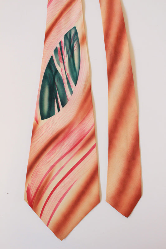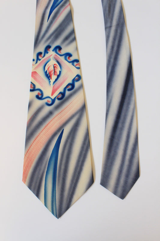 Vintage 1950s Grey/Pink/Blue Abstract Leaf Hand Painted Tie, Made In California