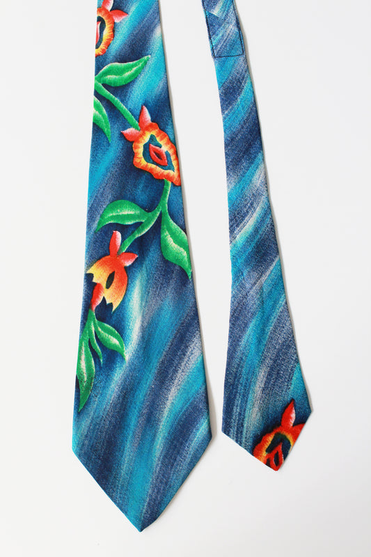 Vintage 1950s Bright Blue And Colourful Flowers Hand Painted Tie