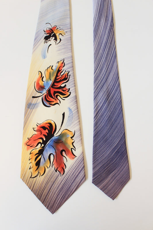 Vintage 1950s Purple And Yellow Fall Leaf Hand-Painted Tie