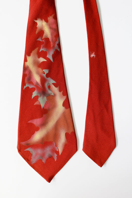 Vintage 1950s Orange and Green Leaf Hand Painted Rayon Tie