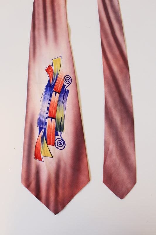 Vintage Late 1940s Rayon Burgundy Primary Colours Abstract Hand-Painted Tie, Painted In Hollywood