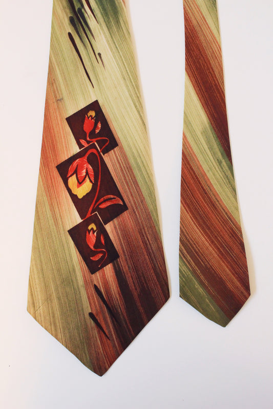 Vintage 1950s Green And Brown Hand Painted Tulip Tie