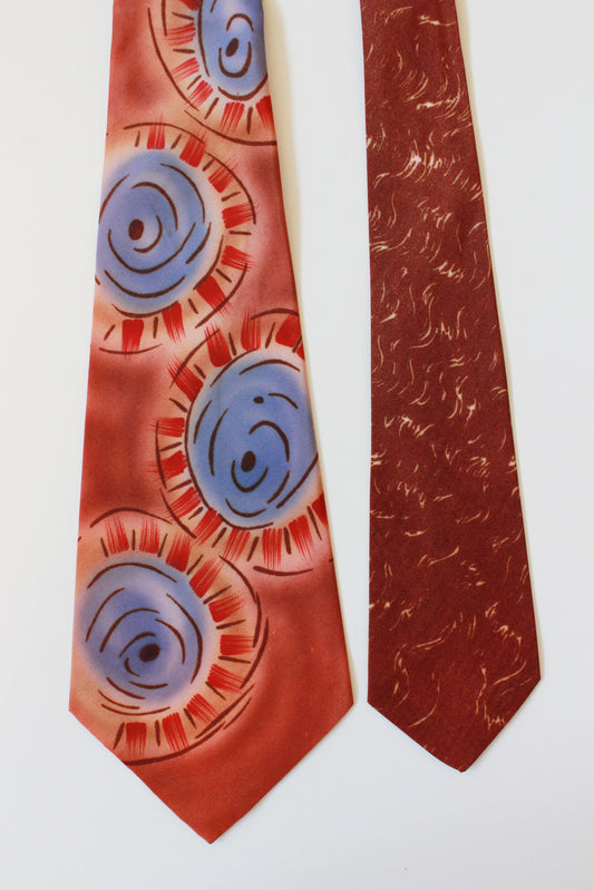 Vintage 1950s Hand Painted Rust And Blue Circles Rayon Mid Century Tie