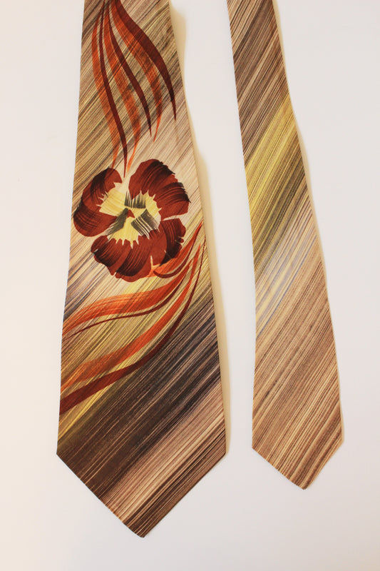 Vintage 1950s Brown And Orange Tropical Flower Hand-Painted Tie