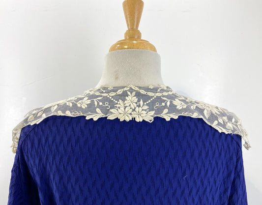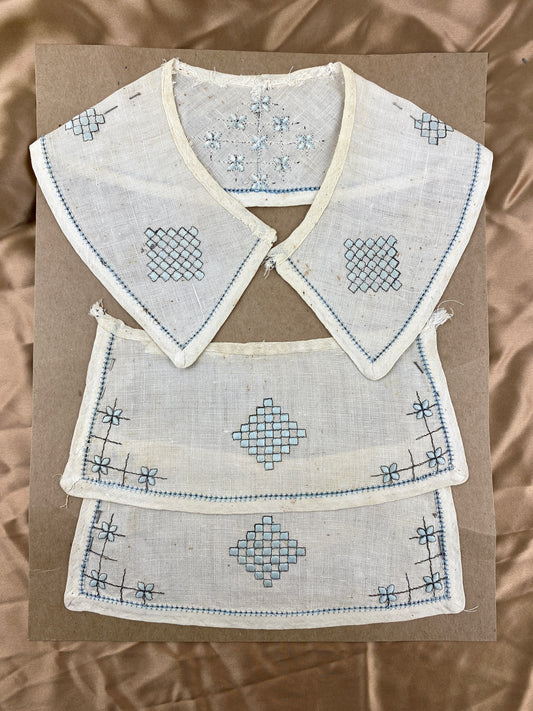 Antique 1910s White/ Blue Embroidered Linen Collar & Matching Cuffs Set