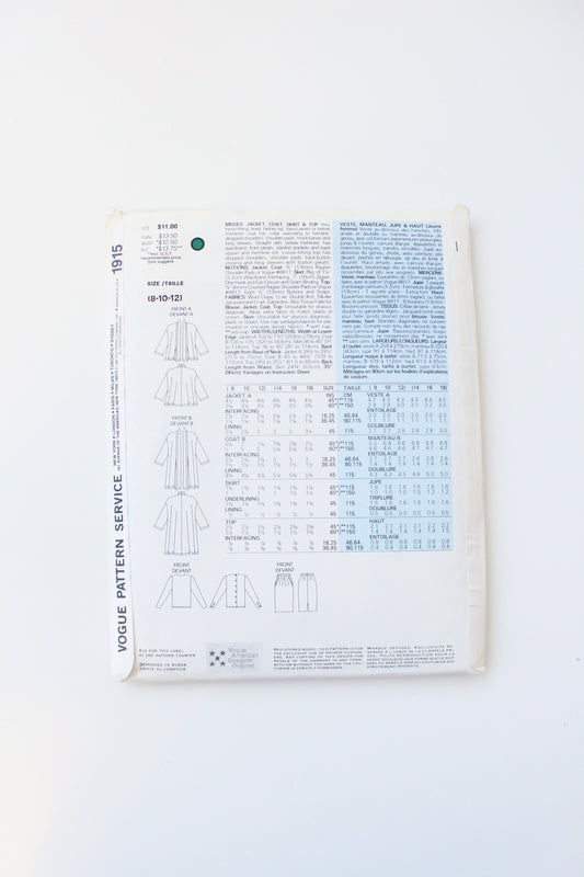 1980s Jacket, Skirt And Top Set Vogue American Designer 1915 Sewing Pattern, Anne Klein, Uncut Size 8-10-12