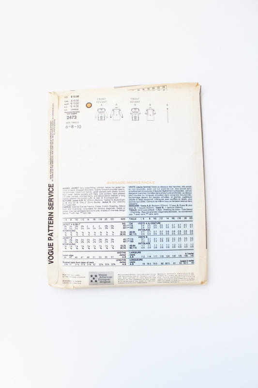 1980s Loose Fitting Jacket Vogue American Designer 2473 Sewing Pattern, Calvin Klein, Uncut Size 6-8-10