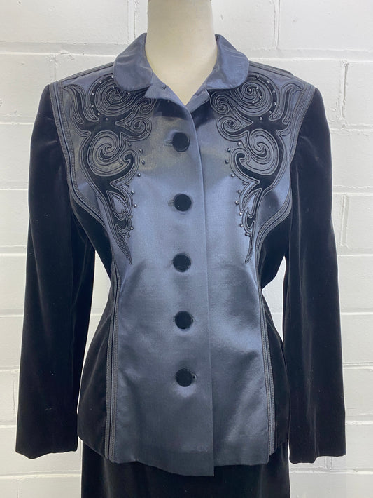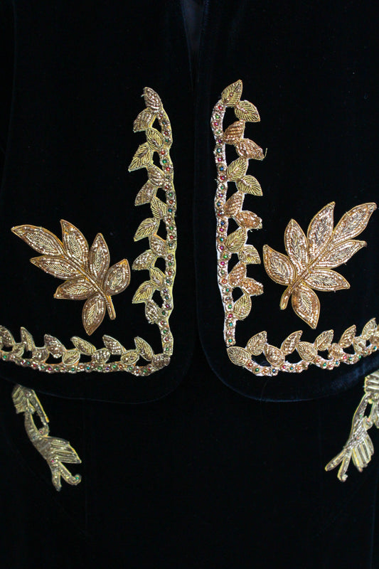 Vintage 1990s Black Velvet Gold Applique Skirt Suit by Mondi, Medium