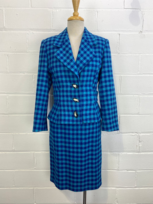 Vintage 90s Guy Laroche Blue Wool Check Skirt Suit, Small