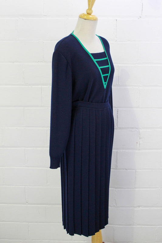 Vintage 1980s Celine Wool Knit Skirt Set, Navy Blue with Turquoise Trim, Medium