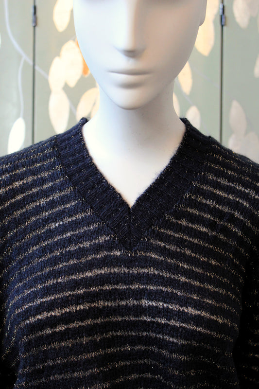 Vintage 1970s Black And Gold Sparkle Pin Stripe Thick V Neck Long Sleeve Kit Sweater, Medium