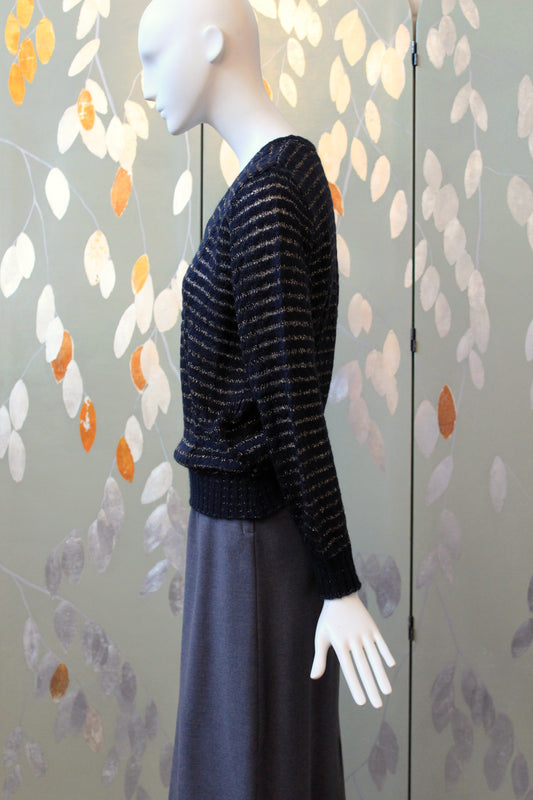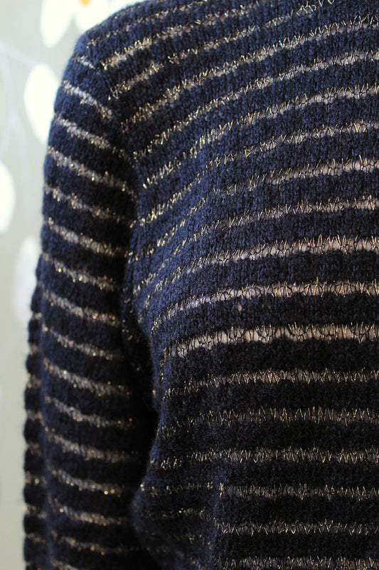 Vintage 1970s Black And Gold Sparkle Pin Stripe Crew Neck Long Sleeve Kit Sweater, Medium