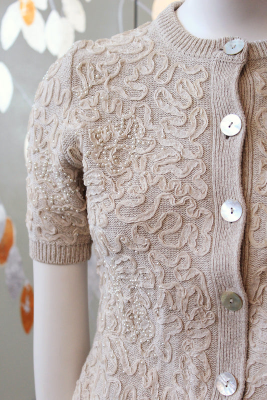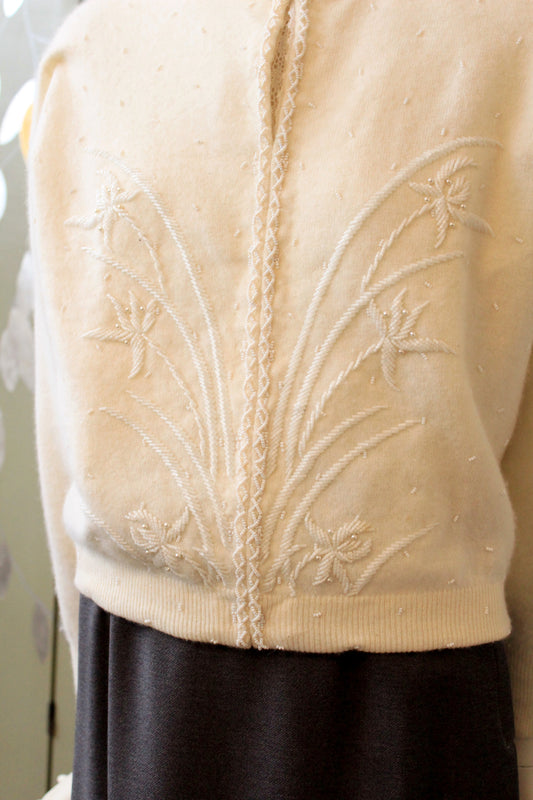 Vintage 1950s Soft Cream Beaded Cardigan Sweater, S/M