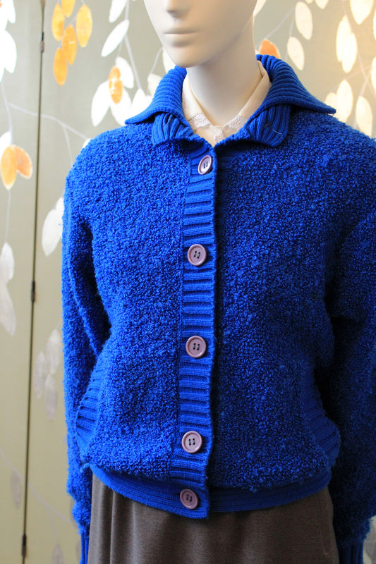 Vintage 1980s Royal Blue Knit Cardigan Sweater, Small