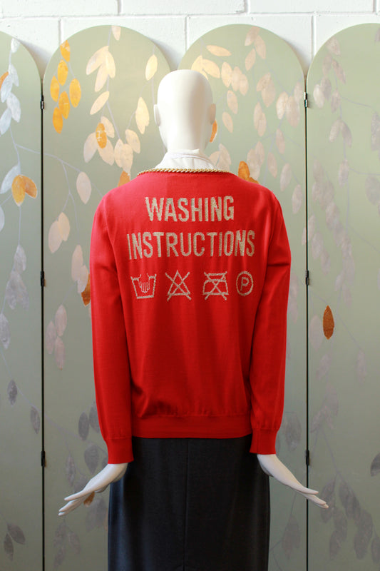 Moschino Red And Gold "Washing Instructions" Cardigan With Gold Charms, Medium