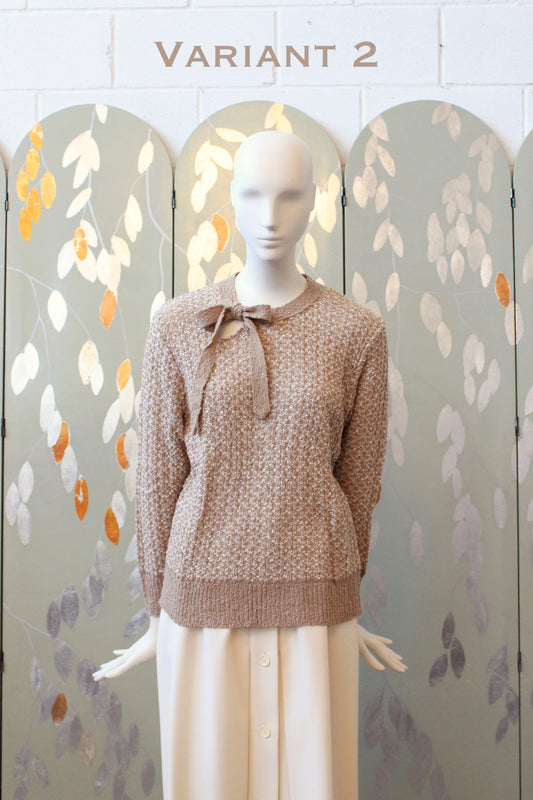 Vintage 1970s Beige and Cream Bow Long Sleeve Knit Sweater, Medium