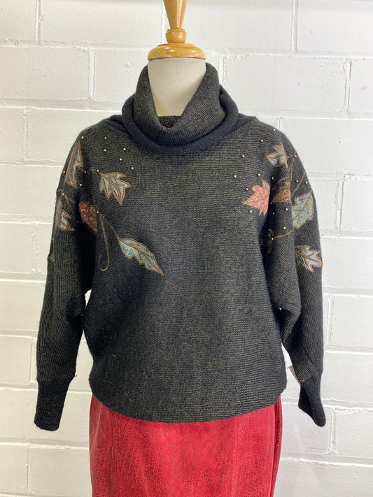 Vintage 1980s Black & Gold Cowl Neck Sweater with Leaf Appliqué, Medium
