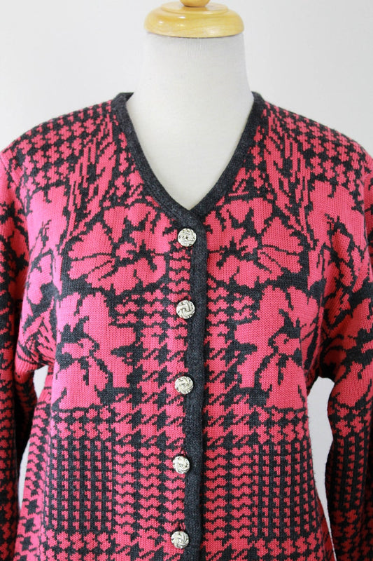 Vintage 80s/90s Floral Houndstooth Knit Cardigan, Medium