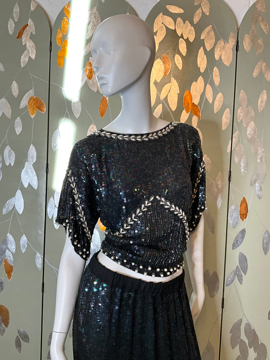 Vintage 1980s Black Silk Sequin and Bead 2-Piece Top and Skirt Set, Large