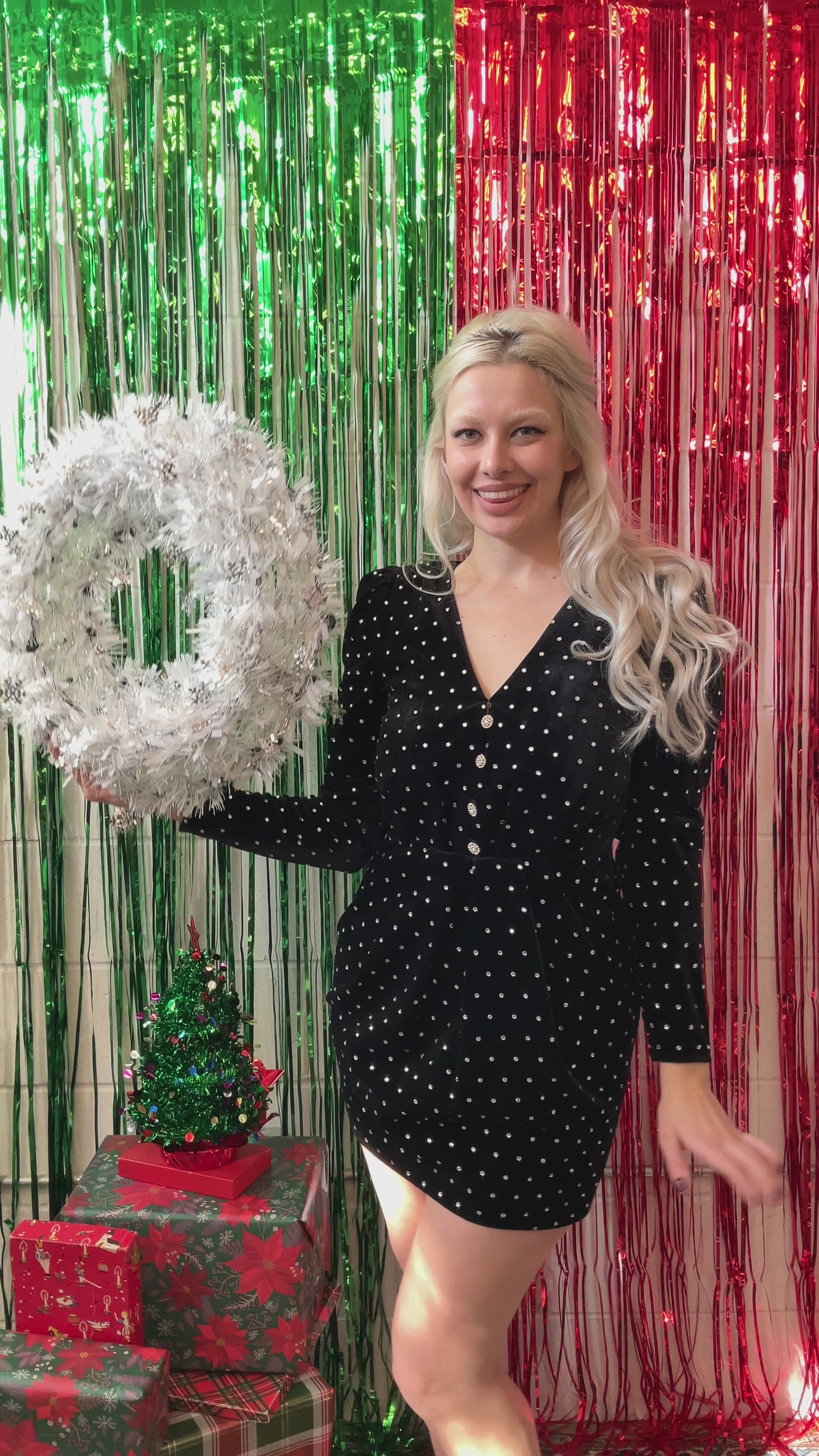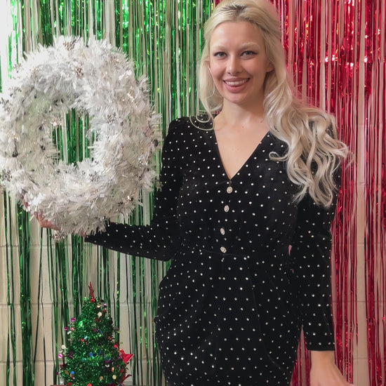 A beautiful black velvet dress from Self Portrait! It's a mini dress that slightly puffs out at the hips. It has functioning pockets and puff sleeves (with small shoulder pads). The neckline is a deep V that leads to small diamanté buttons. This dress would be perfect for a Holiday party because of the sparkle, but also because it has long sleeves, making it a bit warmer if you live in a colder climate. It's also slightly stretchy, so it's extra comfortable !