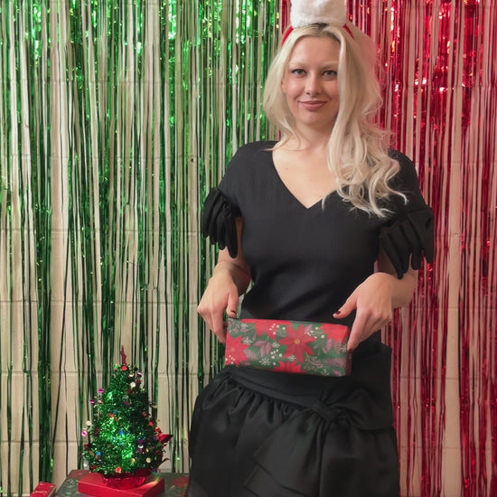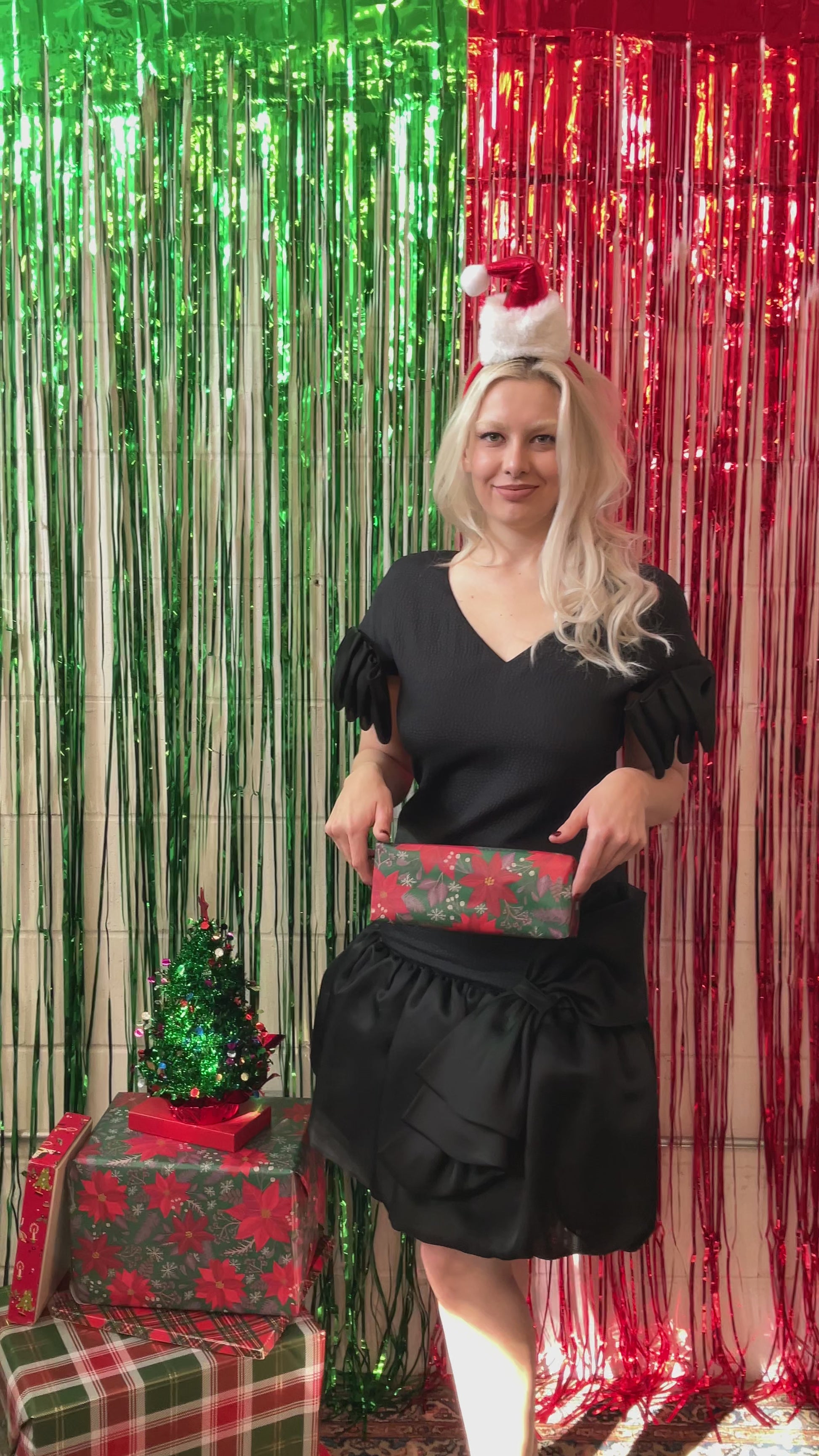 A fun little black party dress from the 80s with a v neck, bubble skirt and dropped waistline! There are large bows adorning each cap sleeve and another one off-centre on the front of the skirt. The body of the dress features a textured fabric, while the skirt and bows are fashioned in a satin fabric, with tulle filling the inside of the skirt.