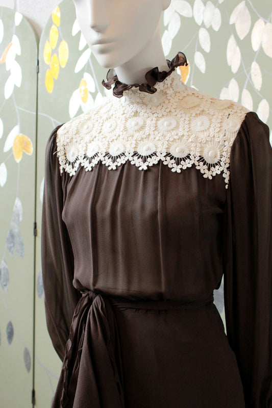 Vintage 1970s Brown PAULE NELSON Silk Chiffon Dress, Edwardian Inspired, XXS