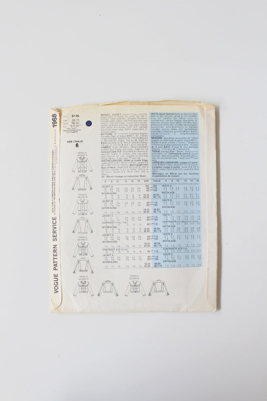 1980s Beginner Easy Miss Jacket Vogue Basic Design 1968 Sewing Pattern, Uncut Size 6