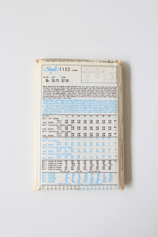 1980s Two Length Lined Coats Style 1152 Sewing Pattern, Uncut Size 6-12