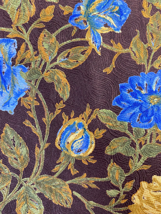 90s Deadstock Silk Necktie, Men's Vintage Brown/ Yellow/ Blue Oak Leaf & Rose Print Tie, NOS
