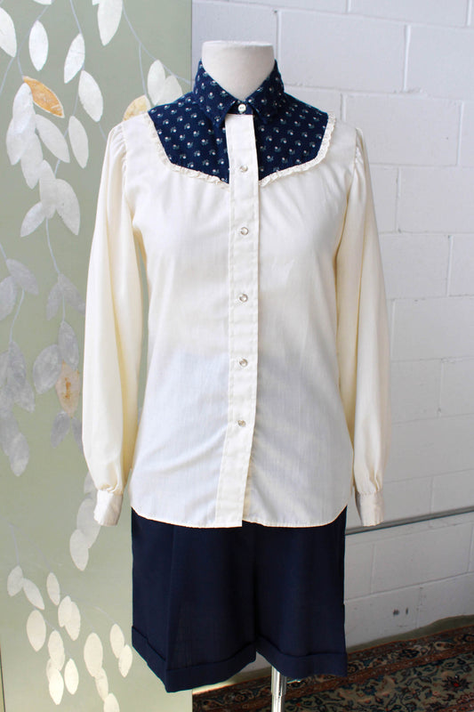 1970s Puff Sleeve Blouse with Floral Print Yoke, Small