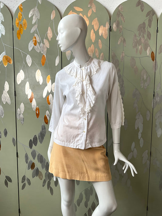 Vintage 1960s/70s White Ruffle Jabot Collar Blouse, S-M