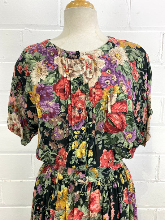 Vintage 1980s Floral Rayon Short Sleeve Dress, Medium