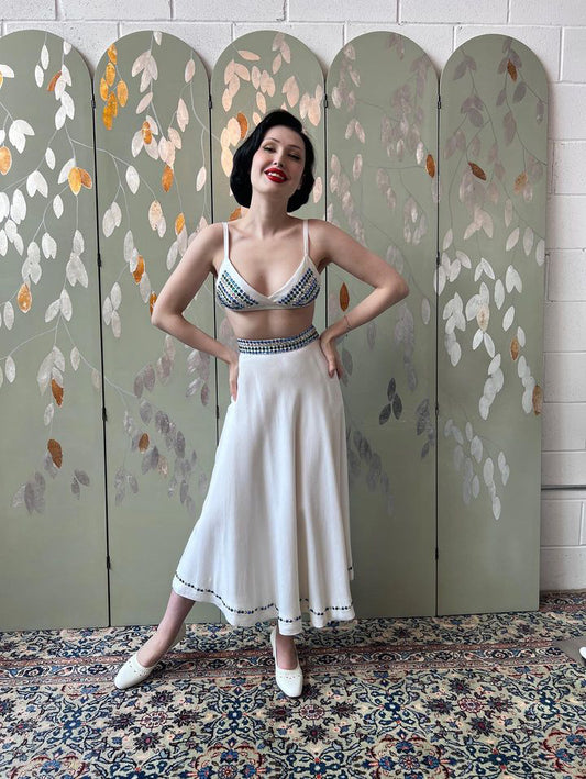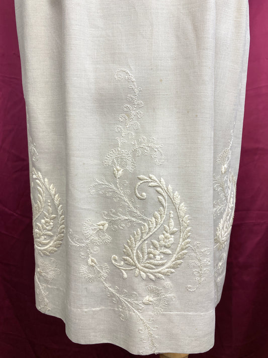 Vintage 1950s Ivory Embroidered Short-Sleeve Linen Sheath Dress, XS