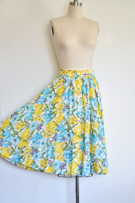 1950s/60s J. Tiktiner Blue and Yellow Floral Button Front Skirt, 27" Waist