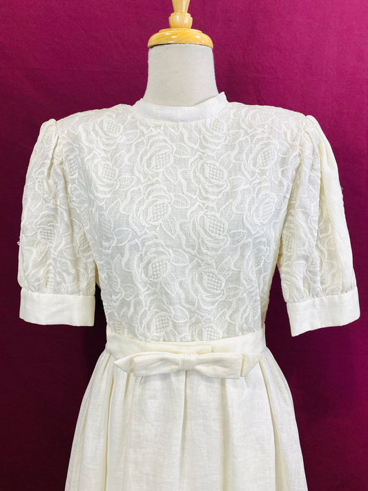 Vintage 1980s Albert Nipon White Linen Puff-Sleeve Embroidered Dress with Bow Belt, Small