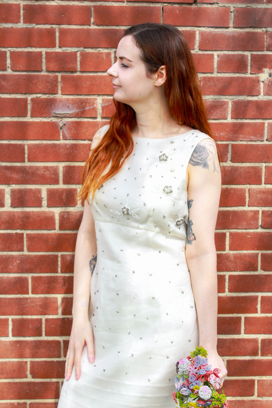 Vintage 1990s Deadstock Laura Ashley Cream Silk Beaded Sheath Dress, Large