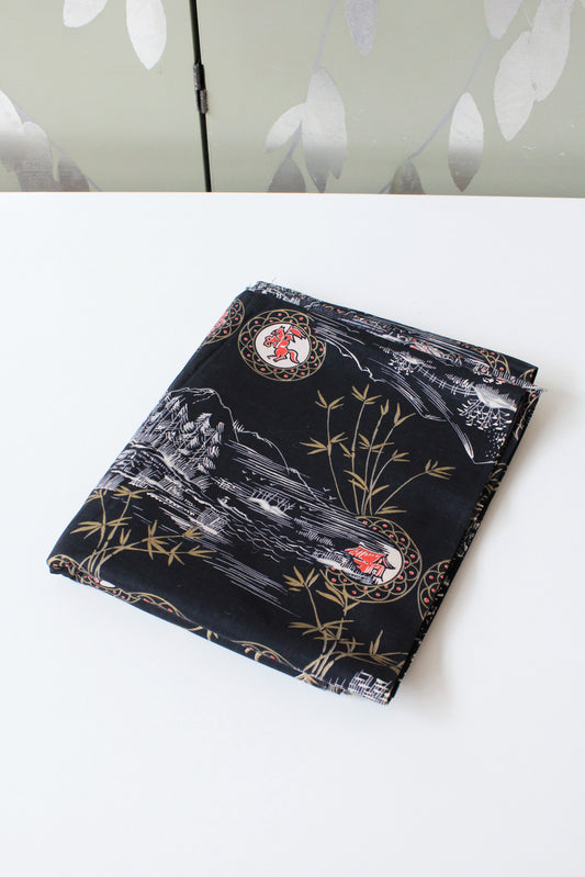 Vintage 1970s Black Cotton Fabric With Chinese Illustrations, 4.9 Yards