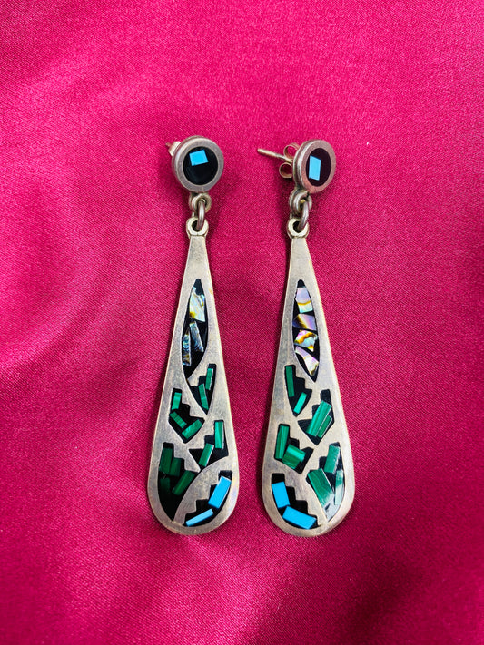 Vintage TAXCO Mexican 925 Silver Shell Inlay Pierced Drop Earrings