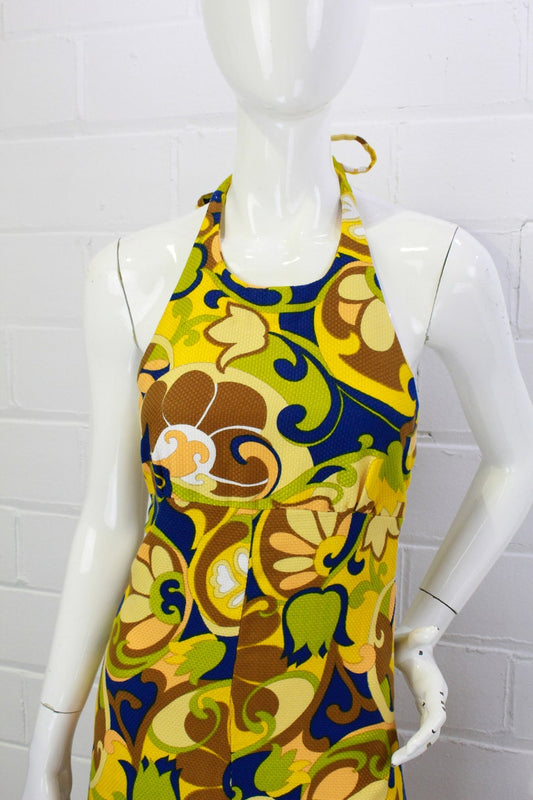 Vintage 1970s Floral Halter Dress, Blue and Green Flower Print, XS