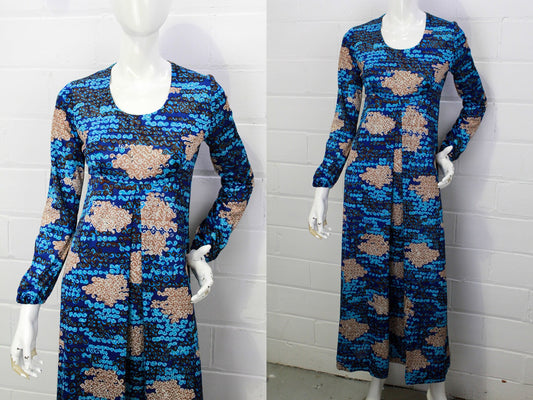 Vintage 1970s Blue Psychedelic Print Long Sleeve Empire Maxi Dress, Small