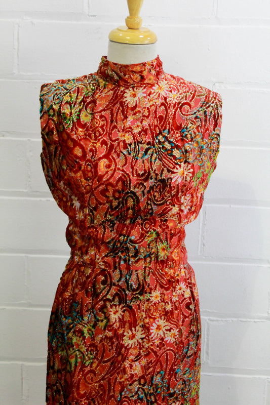 Vintage 1970s Red Velvet Floral Maxi Dress, Small
