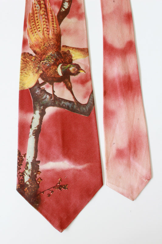 Vintage 1950s Red Rayon Pheasant Photo Print Tie, Mid Century