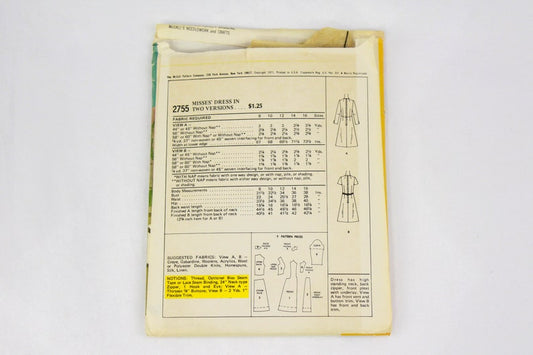 Vintage 1970s Women's Dress Sewing Pattern, McCall's 2755, Complete, Bust 34"