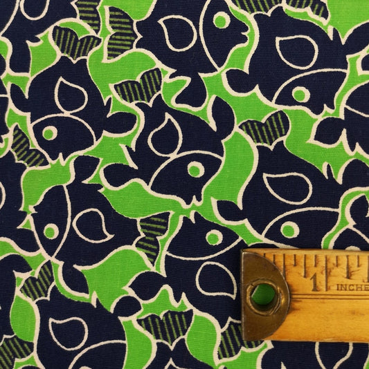 Vintage 80s Green & Blue Fish Print Cotton Fabric, 4+ yrd