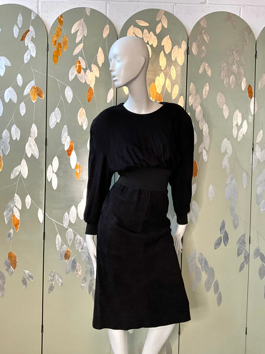 Vintage 1980s Black Suede Blouson Midi Dress, Small