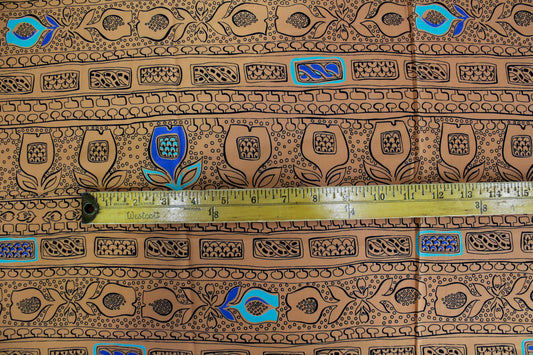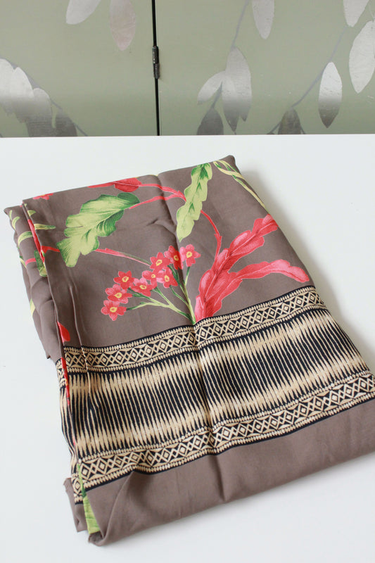 1980s Rayon Border Print In Taupe With Coral And Yellow Flowers 3.1 Yards